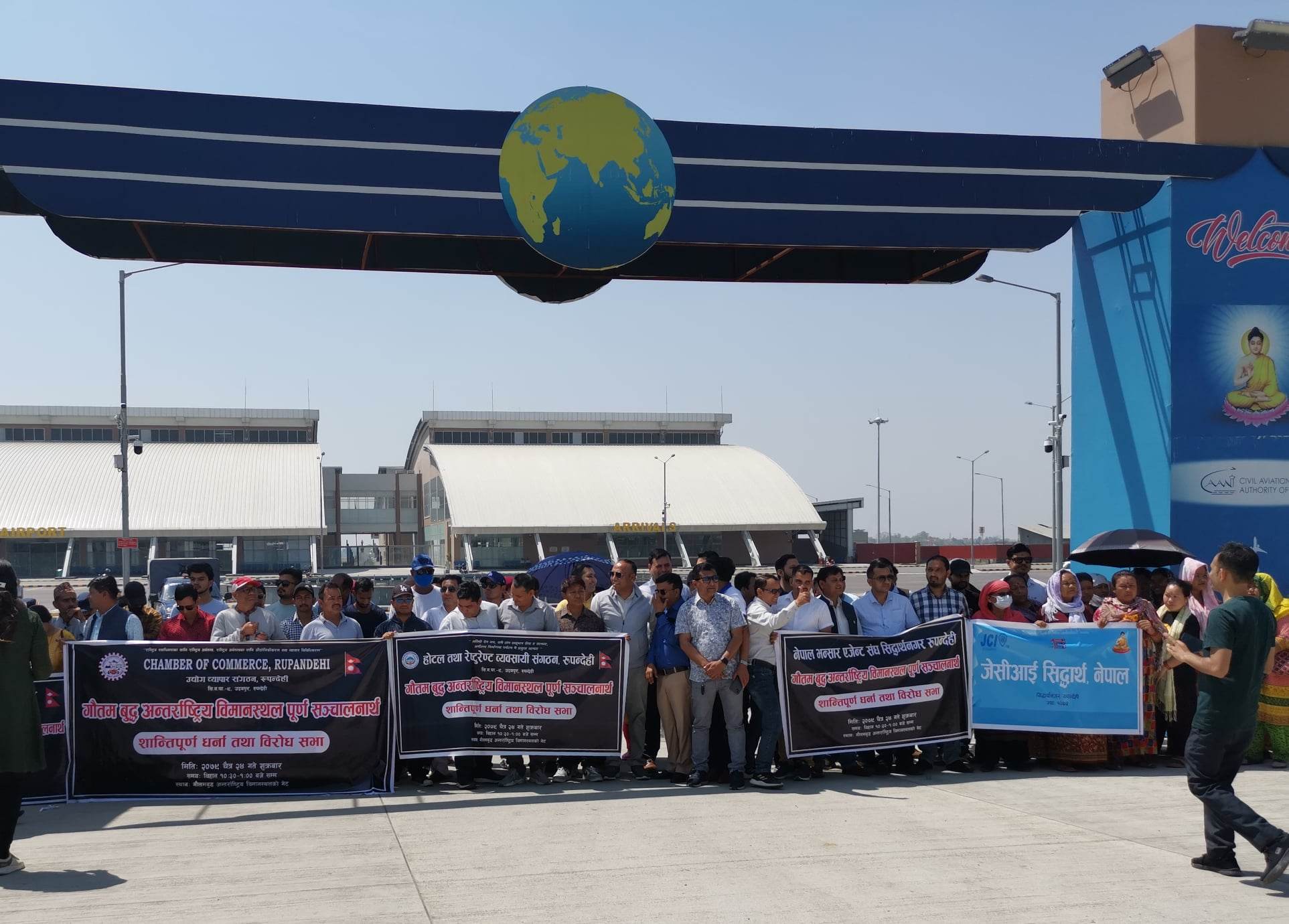 बुटवल । हिजो शुक्रबार भैरहवास्थित गौतमबुद्ध अन्तर्राष्ट्रिय विमानस्थल पूर्ण रुपमासञ्चालनको मागगर्दै निजी क्षेत्र सम्बद्ध संस्थाहरुले विमानस्थल अगाडि धर्ना दिए । र आन्तरिक उडान बन्द गर्ने चेतावनी पनि दिए ।