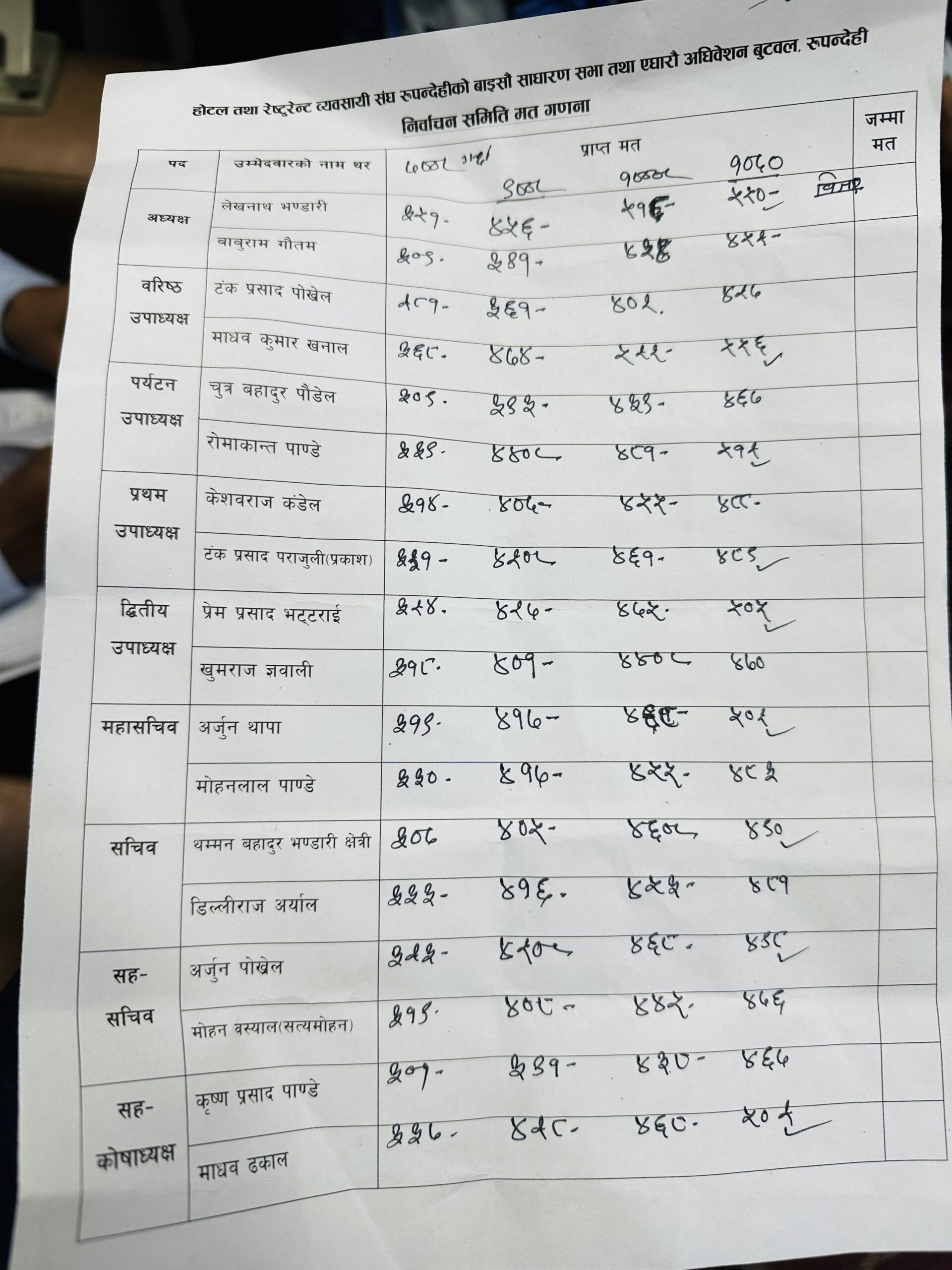 संघकाे बरिस्ठ उपाध्यक्ष पदमा माधव कुमार खनाल,पर्यटन उपाध्यक्षमा राेमाकान्त पाण्डे, प्रथम उपाध्यक्षमा टंक प्रसाद पराजुली (प्रकाश) द्वितीय उपाध्यक्षमा प्रेम प्रसाद भट्टराई ,महासचिवमा अर्जुन थापा,सचिवमा थमन बहादुर भण्डारी ,सहसचिवमा अर्जुन पोखरेल र सह काेषाध्यक्षमा माधव ढकाल निर्वाचित भएका छन् । कोषाध्यक्ष पदमा भने रामबहादुर न्यौपाने यस अघि नै निर्विरोध निर्वाचित भईसकेका छन्।