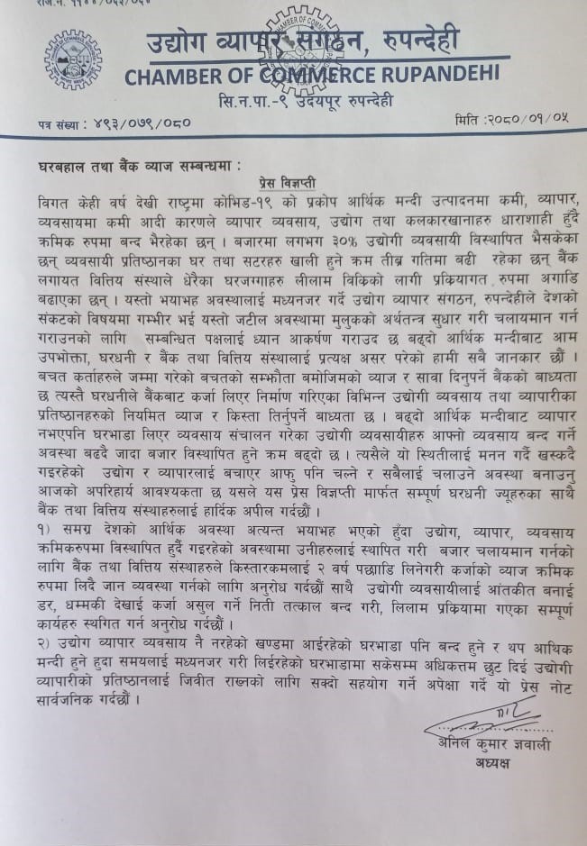 ‘विगत केही वर्षदेखि कोभिड–१९ को प्रकोप आर्थिक मन्दी उत्पादनमा कमी, व्यापार, व्यवसायमा कमीलगायत कारणले व्यापार व्यवसाय, उद्योग तथा कलकारखानाहरु धराशाही हुँदै क्रमिक रुपमा बन्द भइरहेका छन् । बजारमा लगभग ३० प्रतिशत उद्योगी व्यवसायी विस्थापित भइसकेका छन् व्यवसायी प्रतिष्ठानका घर तथा सटरहरु खाली हुने क्रम तीव्र गतिमा बढिरहेका छन् बैंकलगायत वित्तीय संस्थाले धेरैका घरजग्गाहरु लिलाम विक्रीको लागी प्रक्रियागत रुपमा अगाडि बढाएका छन्, ’विज्ञप्तीमा उल्लेख छ ।