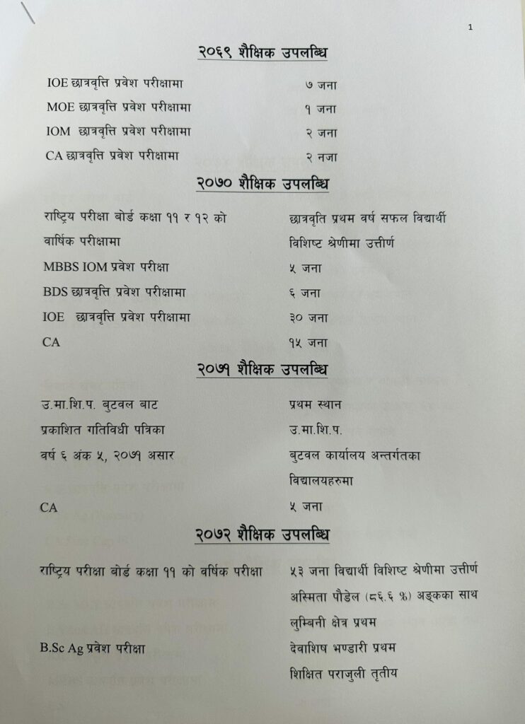 बुटवलको योगिकुटीस्थित मणिमुकुन्द कलेजले आफ्ना विद्यार्थीहरुले शैक्षिक र अतिरिक्त क्रियाकलापमा हासिल गरेका उपलब्धीहरु सार्वजनिक गरेको छ ।