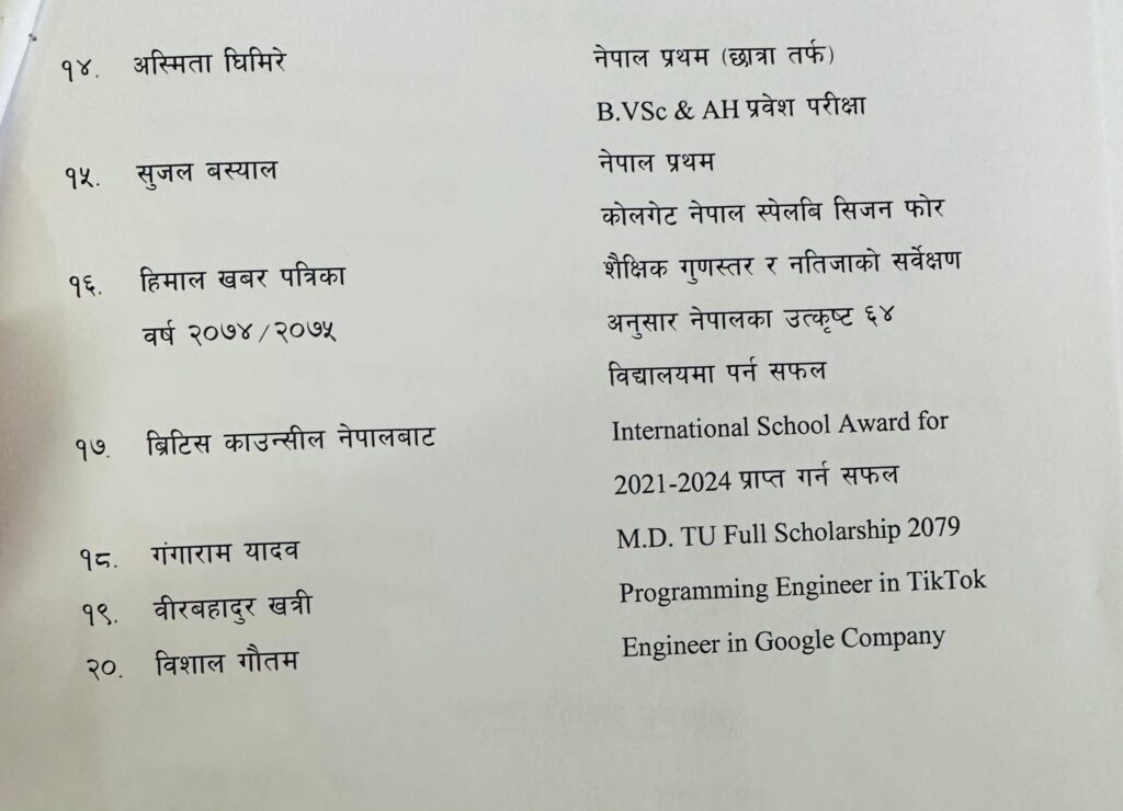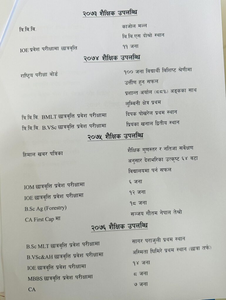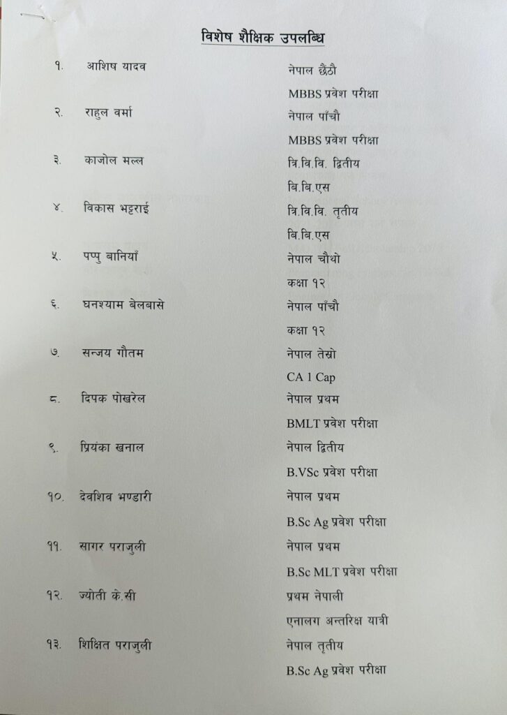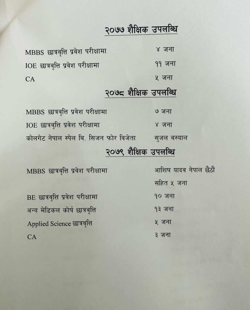शनिबार कलेजमा पत्रकार सम्मेलन गरी प्राचार्य टुकबहादुर क्षेत्रीले कलेजमा पढेका आशिष यादवले गत वर्ष लिइएको एमबीबीएसको पूर्ण छात्रवृत्ति प्रवेश परीक्षामा नेपाल छैठौं भएको जानकारी गराए । यस्तै त्यसअघिको एमबीबीएसको प्रवेश परीक्षामा राहुल वर्मा नेपाल पांचौं भएका उनले बताए । यस्तै काजोल मल्ल बीबीएसमा त्रिविवि दोस्रो र विकास भट्टराई त्रिविवि तेस्रो भएको बताए ।