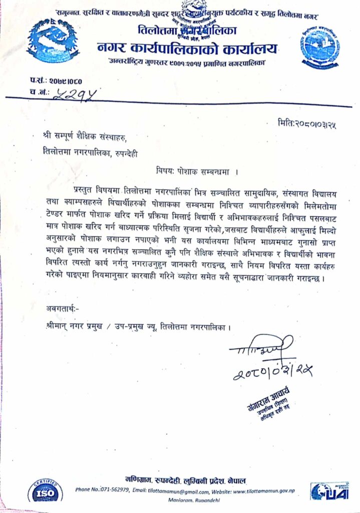 एक सूचना जारी गर्दै नगरपालिकाले अभिभावक र विद्यार्थीको भावना विपरित निश्चित पसलबाट मात्र विद्यार्थीहरुको पोशाक खरिद गर्नुपर्ने बाध्यात्मक परिस्थिति सृजना नर्गन भनेको छ ।