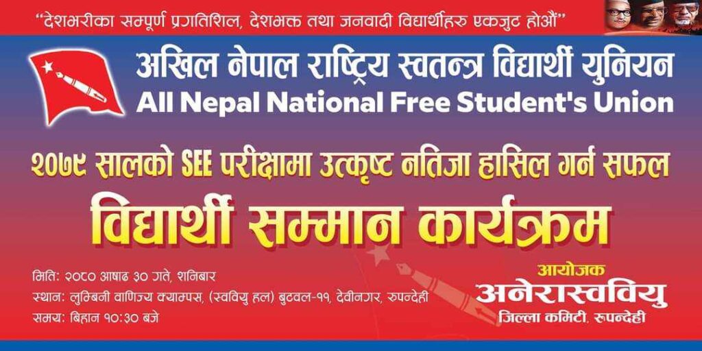 अनेरास्ववियु रुपन्देही जिल्ला कमिटीले आयोजना गरेको एसईईमा उत्कृष्ट अंक ल्याउने विद्यार्थीहरुलाई सम्मान गर्ने कार्यक्रममा सम्बोधन गर्न एमाले अध्यक्ष ओली बुटवल आउने भएका हुन ।
