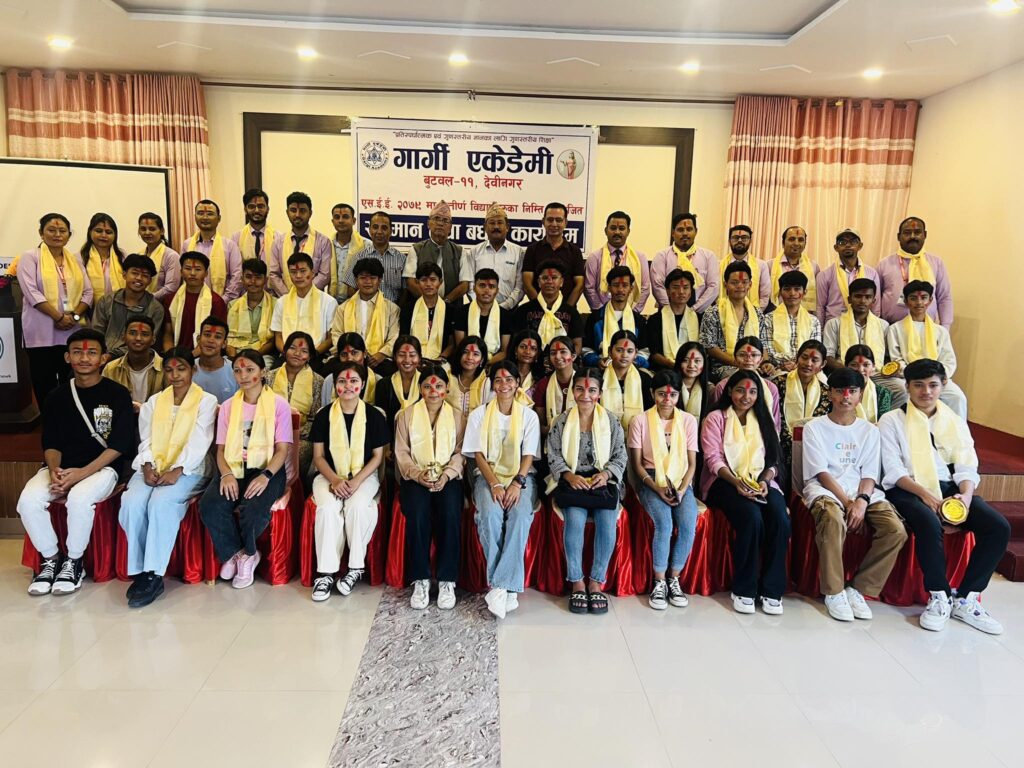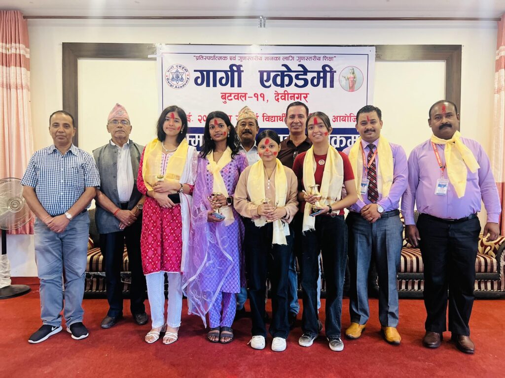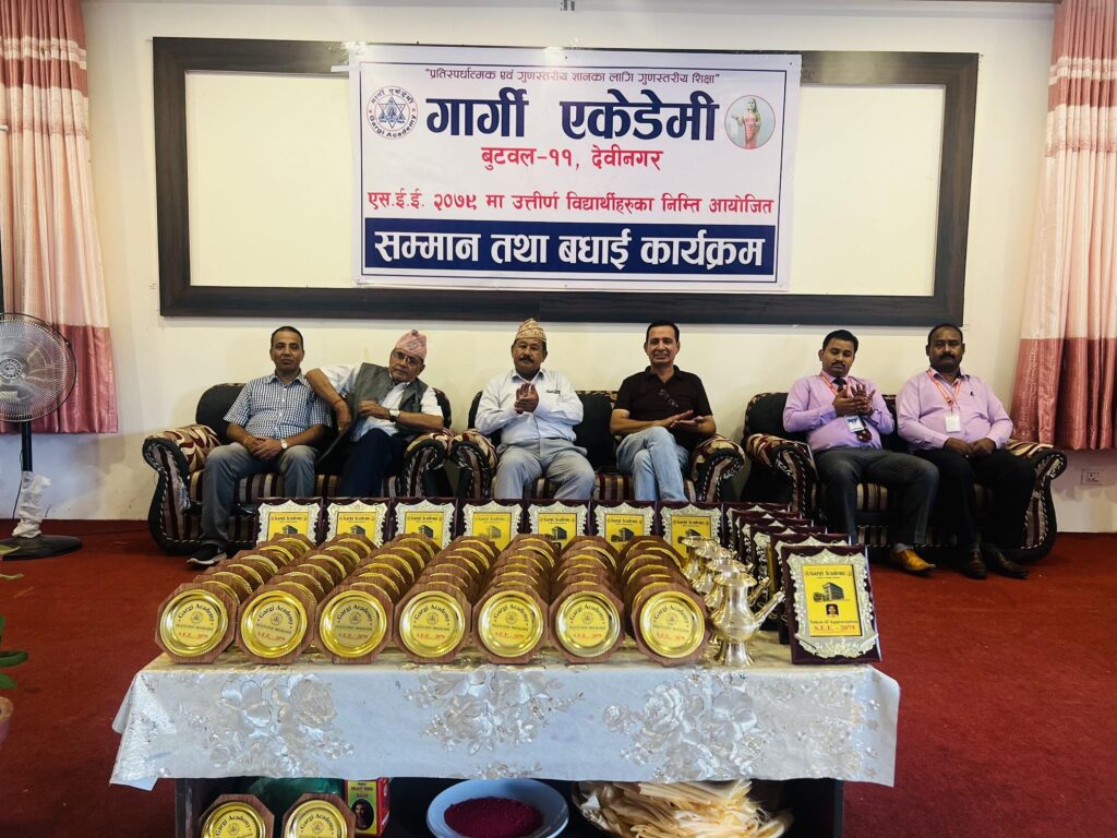 बुटवल । बुटवल–११ देवीनगरस्थित गार्गी एकेडेमीमा २०७९ सालको एसईई परीक्षा उत्तीर्ण विद्यार्थीहरुलाई बधाई ज्ञापनसहित सम्मान गरिएको छ ।