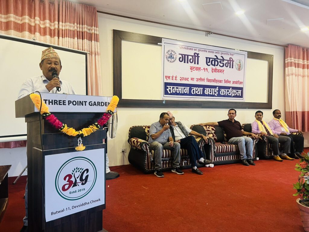 बुटवल । बुटवल–११ देवीनगरस्थित गार्गी एकेडेमीमा २०७९ सालको एसईई परीक्षा उत्तीर्ण विद्यार्थीहरुलाई बधाई ज्ञापनसहित सम्मान गरिएको छ ।