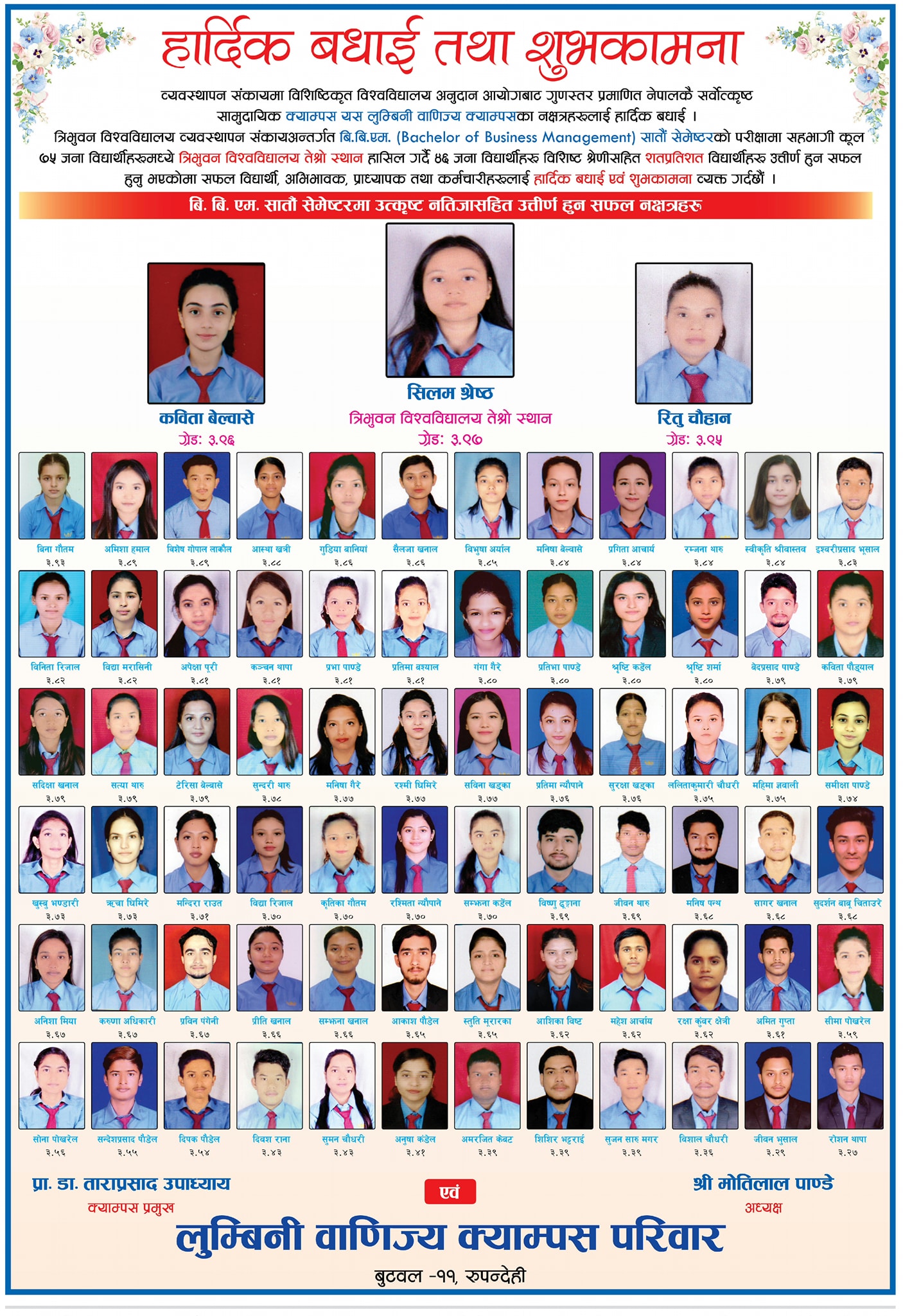 विद्यार्थी सिमल श्रेष्ठले ३ दशमलव ९७ ग्रेड ल्याउँदै त्रिभुवन विश्वविद्यालय तेस्रो स्थान हासिल गरेकी हुन । त्यस्तै रितु चौहानको ३ दशमलव ९५ र कविता बेल्बासेको ३ दशमलव ९६ ग्रेड आएको क्याम्पस प्रमुख उपाध्यायले बताए ।