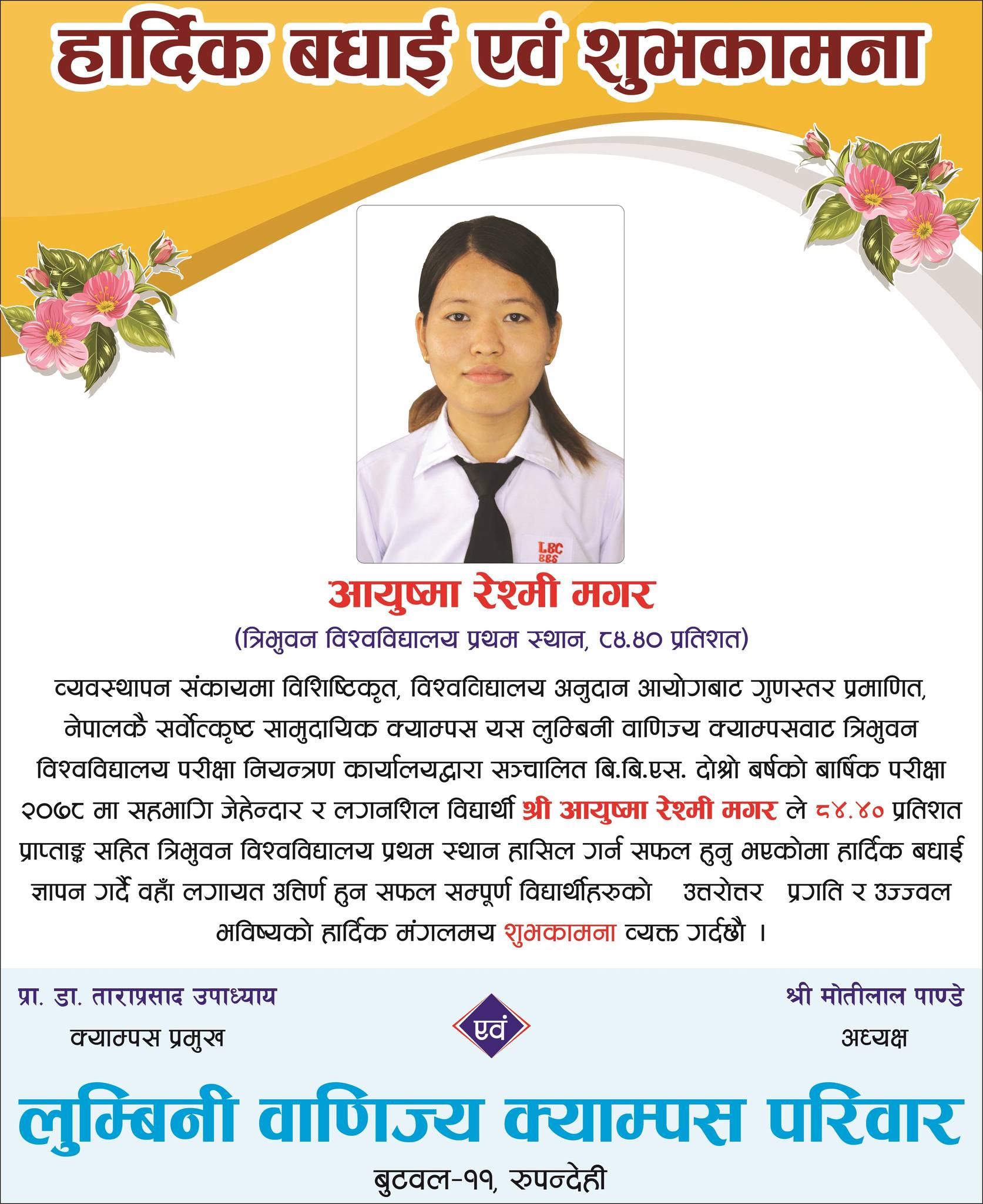 त्यस्तै वि.वि.एस दोस्रो बर्षको बार्षिक परीक्षामा आयुष्मा रेश्मी मगर त्रिभुवन विश्वविद्यालयमा प्रथम भएकी छन् । उनले ८४ दशमलव ४० प्रतिशत ल्याउँदै प्रथम भएको उनले बताए ।