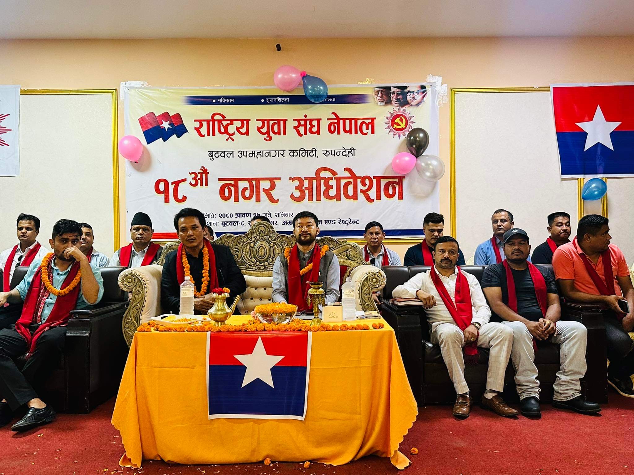 बुटवल । राष्ट्रिय युवा संघ बुटवल उपमहानगर कमिटीको शनिबार बुटवलमा सम्पन्न १८ औं नगर अधिवेशनले गणेशबोहोराको अध्यक्षतामा नयाँ नेतृत्व चयन गरेको छ । अधिवेशनले उपाध्यक्षमा विरु लामिछाने, सचिव राजेन्द्र थापा, सहसचिव थमन पुन र विजय भुसाल तथा कोषाध्यक्ष कुशल थापा रहने गरी ३५ सदस्य कमिटी गठन गरेको हो ।
