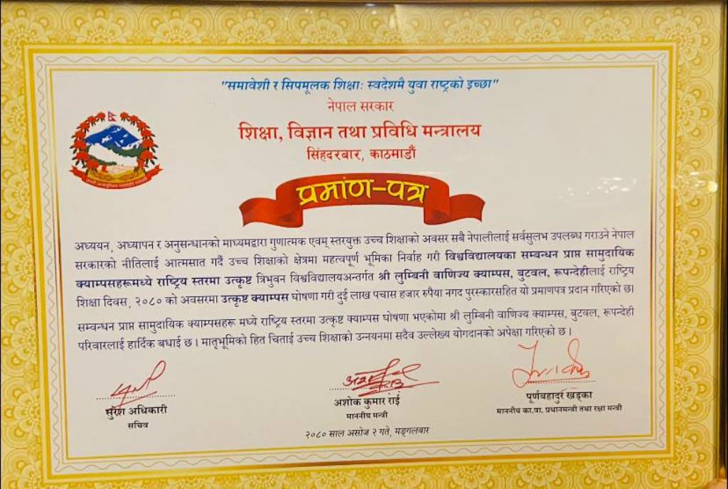 सामुदायिक क्याम्पसहरु मध्ये २०७५ सालमा नेपालकै उत्कृष्ट सामुदायिक क्याम्पसको रुपमा नेपाल सरकार शिक्षा, विज्ञान तथा प्रविधि मन्त्रालयबाट सम्मानित लुम्बिनी वाणिज्य क्याम्पस राष्ट्रिय शिक्षा दिवस–२०८० को अवसरमा पुनः उत्कृष्ट सामुदायिक क्याम्पसको रूपमा सम्मानित भएको हो ।