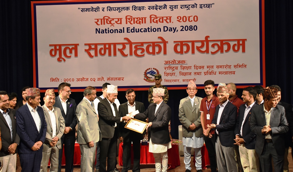 नेपाल सरकारको नीतिलाई आत्मसात गर्दै उच्च शिक्षाको क्षेत्रमा महत्वपूर्ण भुमिका निर्वाह गरेको भन्दै राष्ट्रिय शिक्षा दिवस २०८० को अवसरमा प्रमाणपत्र तथा दुई लाख पचास हजार रुपैयासहित प्रज्ञा भवन काठमाडौंमा आयोजित एक समारोहका बिच माननीय कार्यवाहक प्रधानमन्त्री तथा रक्षा मन्त्री पूर्णबहादुर खड्काले प्रदान गरे ।