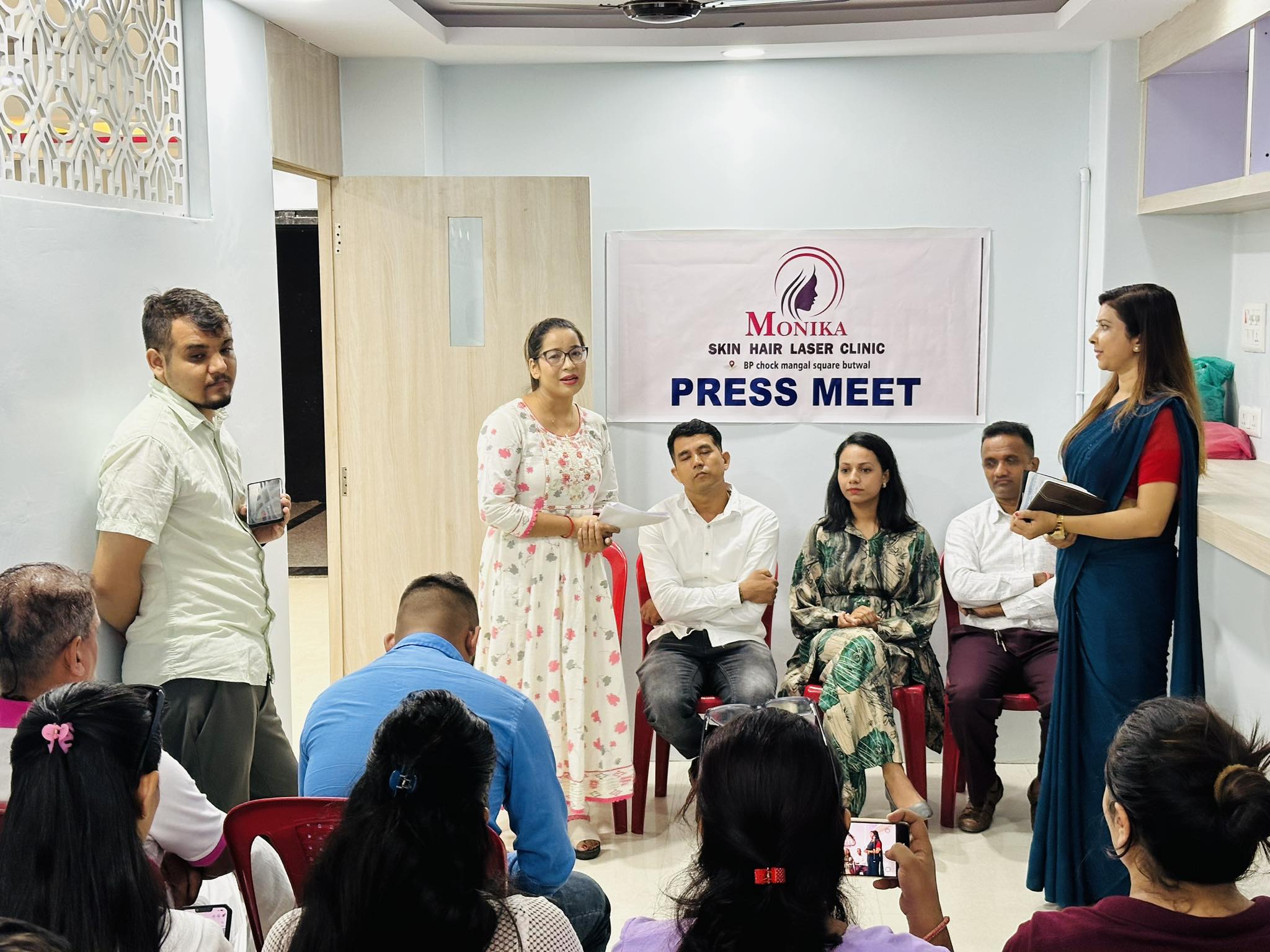 साथै फर्मासिस्ट दिपक क्षेत्री ,नर्स जुही श्रेष्ठले भने दैनिक रुपमा सेवा प्रदान गर्ने बताइन् । यस्तै पत्रकार सम्लेनमा वरिष्ठ सौन्दर्यकर्मी मोना पाठकले एकै जनाले शैलुन र स्किन सम्बन्धी काम गर्दा समास्या आउने गरेकाले व्यवसायीक रुपमा नै शैलुन र स्किन केयर संचालन गर्नु धेरै राम्रो भएको बताइन् । साथै मोनिका क्षेत्री आफुले सिकाएको विद्यार्थी रहेको र आफुले सिकाएको विद्यार्थीले गरेको कामबाट धेरै खु्शि लागेको बताइन् ।