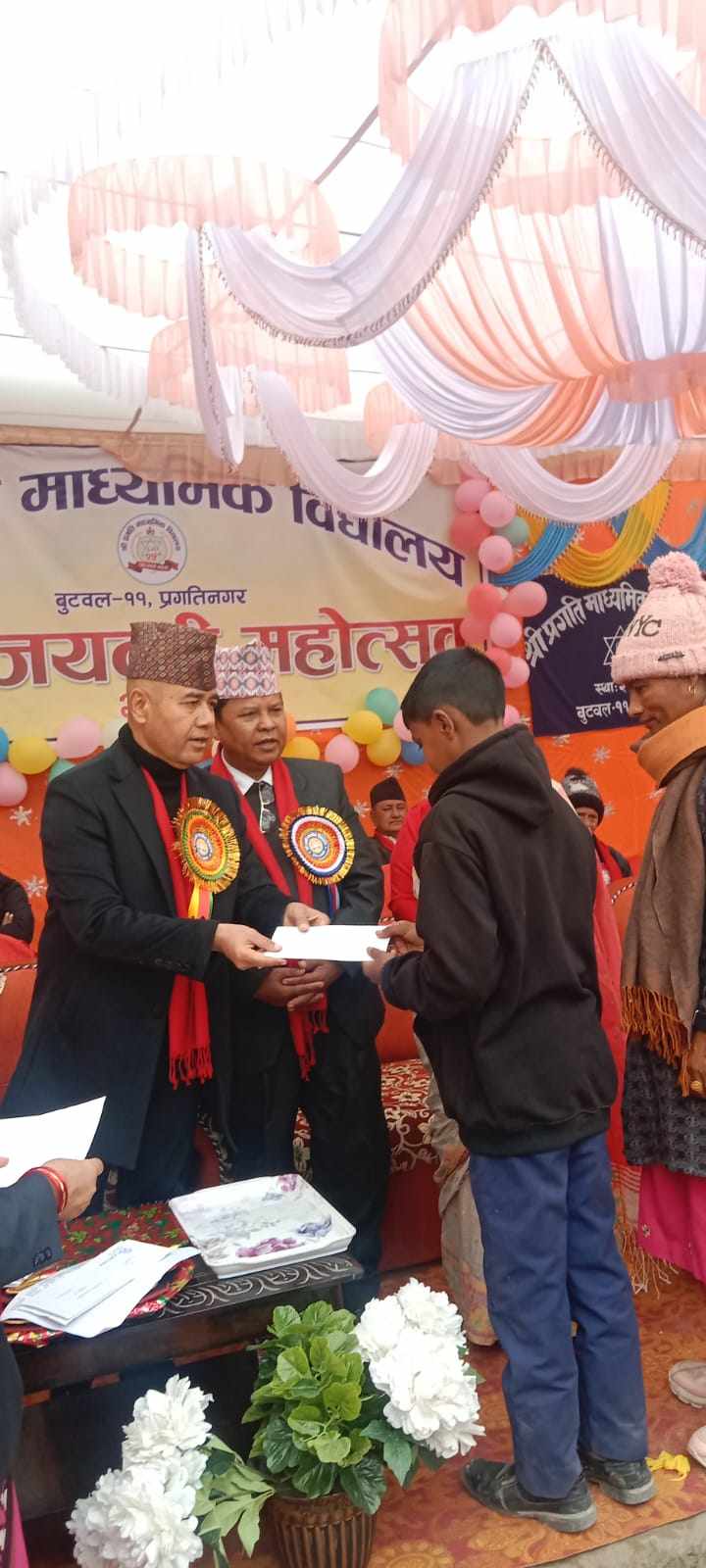 बुटवल । बुटवल उपमहानगरपालिका-११ स्थित प्रगती माध्यामिक विद्यालयलको रजत जयन्ती महोत्सव अन्तरगत युवा व्यवसायी तथा समाजसेवी गोपाल रानाले छात्रवृत्ती वितरण गरेका छन् ।