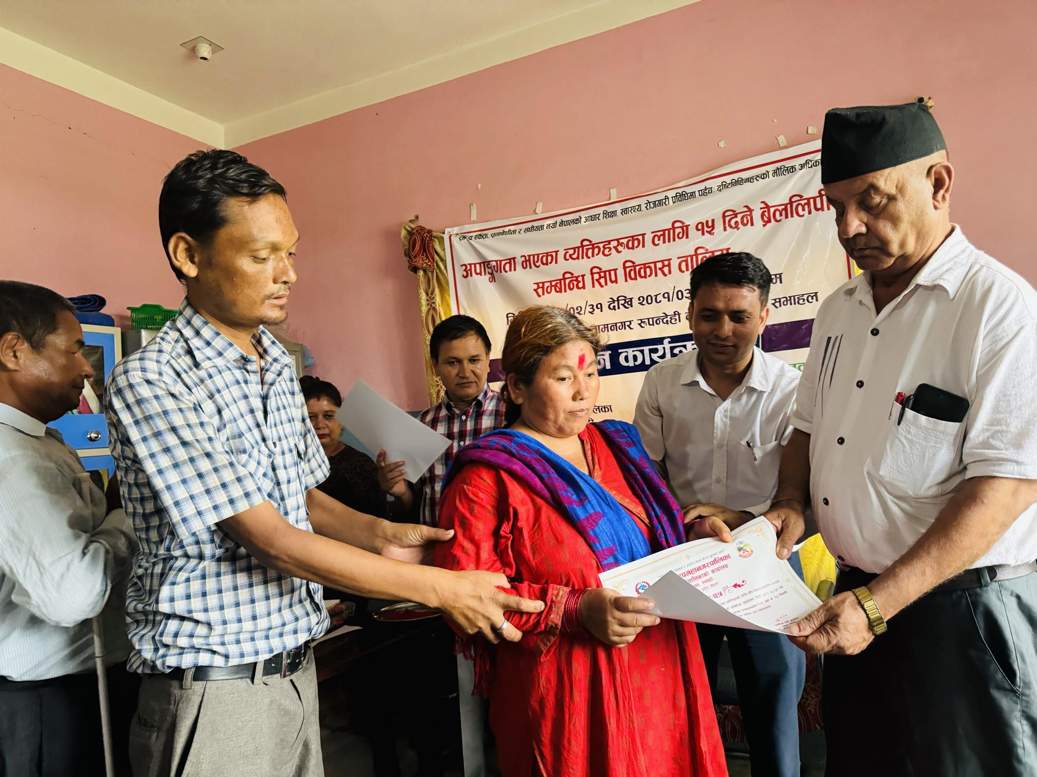 १५ दिन सम्म चलेको तालिमममा दिलमाया चौधरी र अविना पन्थीले सहजीकरण गरेका थिए । तालिम समापन कार्यक्रममा बुटवल उपमहानरपालिका पञ्जीकरण महाशाखा बाट नारायण अर्याल, दिवस श्रेष्ठ, संस्थाका कोषाध्यक्ष ओम बहादुर सिंह, श्रवण दृष्टिविहिन परियोजना प्रेम आचार्य लगायतको सहभागीता रहेको थियो ।