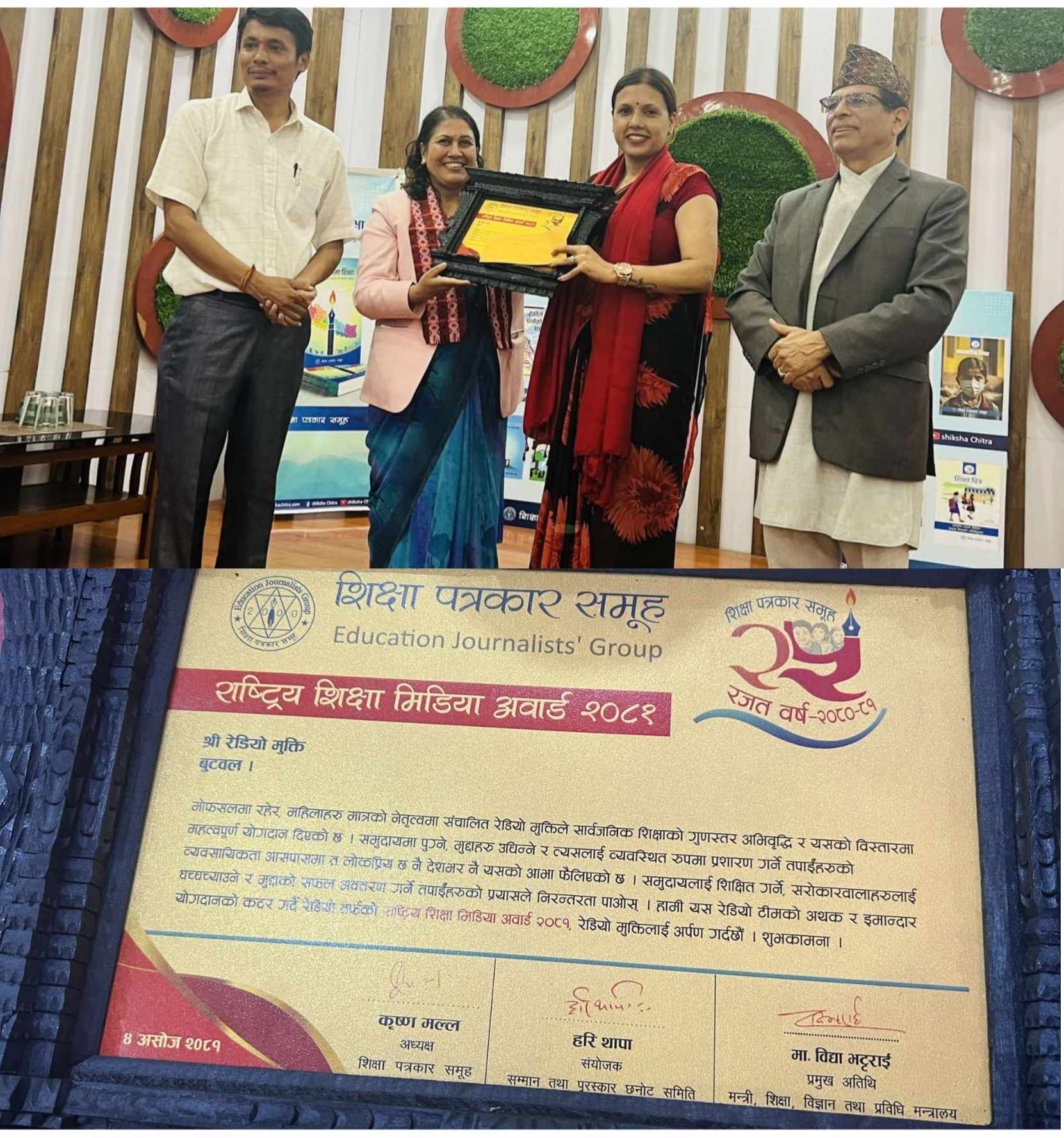 मोफसलमा रहेर महिलाहरुको नेतृत्वमा संचालित सामुदायिक रेडियोले सार्वजनिक शिक्षाको गुणस्तर अभिबृद्धि, र यसको बिस्तारमा पुर्र्याएको योगदानका आधारमा अवार्ड प्रदान गरिएको समुहका सम्मान तथा पुरस्कार छनोट समितिका संयोजक हरि थापाले बताए । महिलाहरुद्धारा सञ्चालित रेडियो मुक्ती बिगत १६ बर्षदेखि लुम्बिनी प्रदेशको बुटवलबाट ९५ थोप्लो ५ मेगाहर्जबाट प्रसारण हुदै आएको छ ।