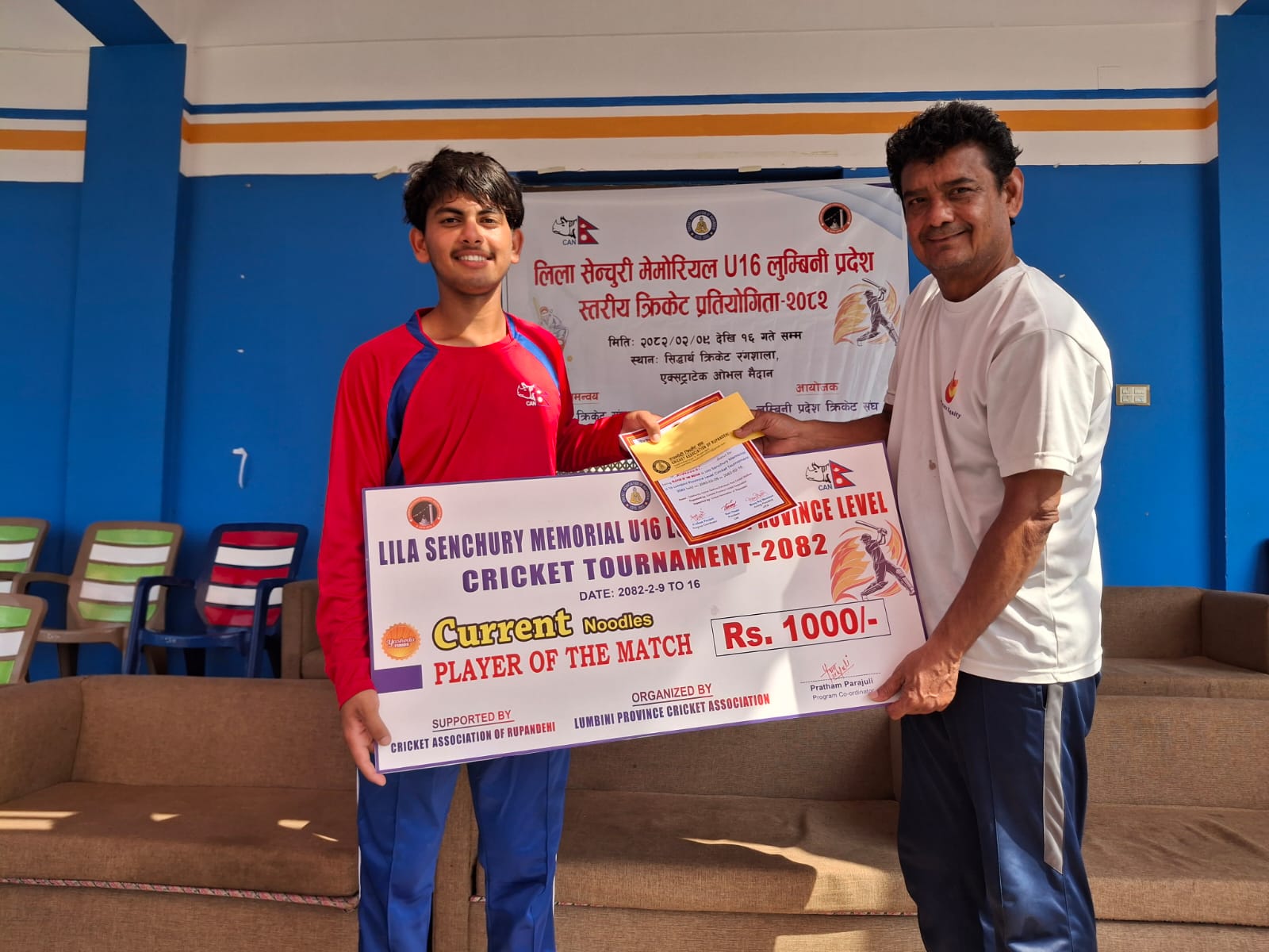जवाफी ब्याटिङ गरेको नवलपरासी १६ ओभरमा अलआउट हुँदै जम्मा ४५ रनमै समेटियो । उसका लागि प्रेमसागर यादवले १३ र आरोनजंग गिरीले १२ रन बनाउनु बाहेक अन्य ब्याटरले दोहोरो अंकमा रन बटुल्न सकेनन् । बलिङमा रुपन्देहीका लक्ष्मण कुमाल, प्रिन्स पाल र तुसार चौहानले समान २–२ तथा सोइब हसन मुसलमान र सुप्रिम कंडेलले १–१ विकेट लिए । खेलमा रुपन्देहीका समीर अली मुसलमान प्लेयर अफ द म्याच घोषित भएको प्रदेश क्रिकेट संघका सदस्य एवं खेल संयोजक प्रथम पराजुलीले बताए ।