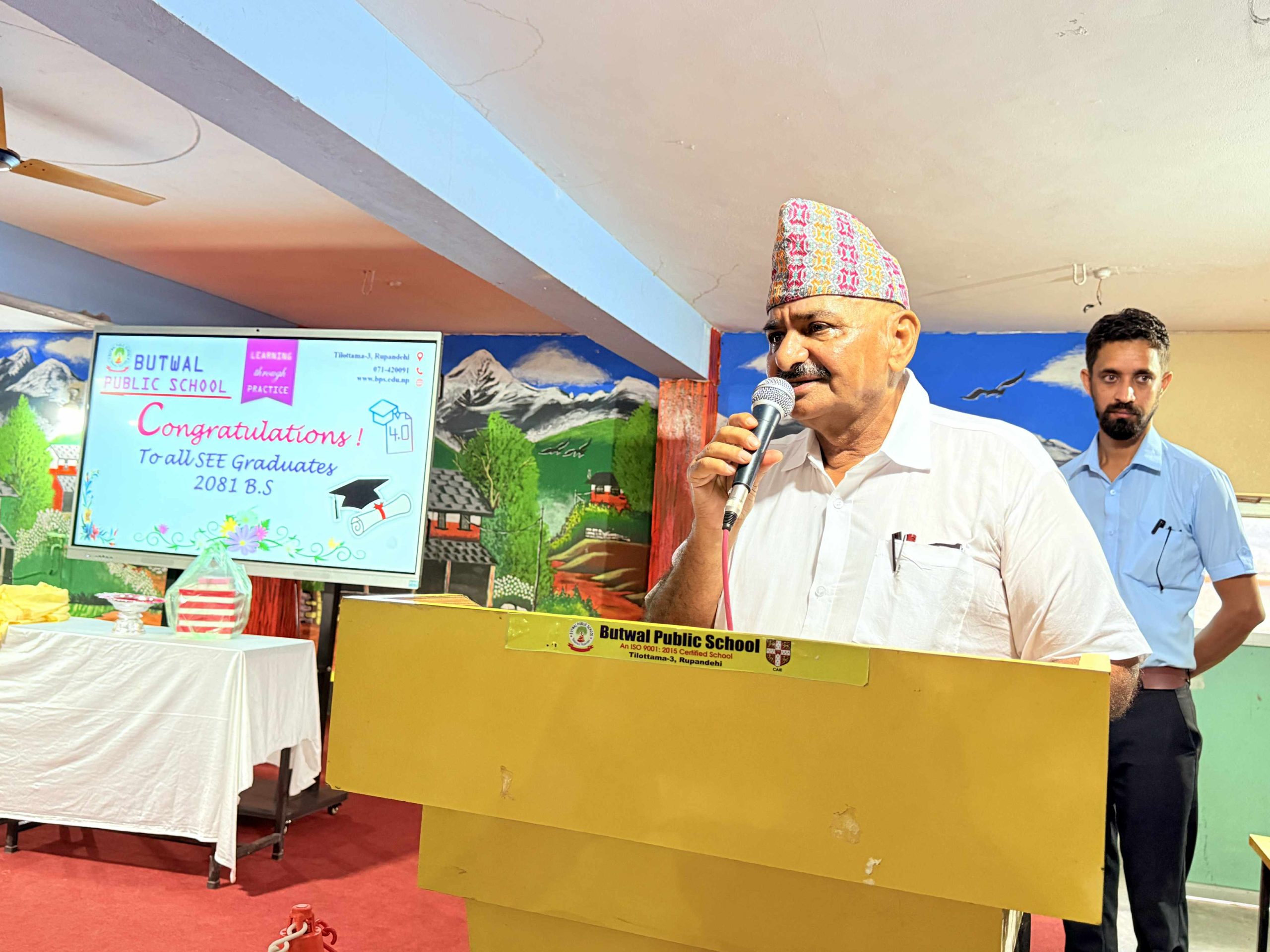 बुटवल । रुपन्देहीको तिलोत्तमा–३ स्थित बुटवल पब्लिक स्कुलले माध्यमिक शिक्षा परीक्षा (एसईई) नजितामा उत्कृष्ट अंक ल्याउने विद्यार्थीहरुलाई सम्मान गरेको छ । सोमबार एक कार्यक्रमका बीच विद्यालयका संस्थापक प्राचार्य हेमलाल शर्मा, तिलोत्तमा नगरपालिका वडा न. ३, शिक्षा समन्वय ईकाइकी चुडाकुमारी विष्टले विद्यार्थीहरुलाई सम्मान गरेका थिए ।