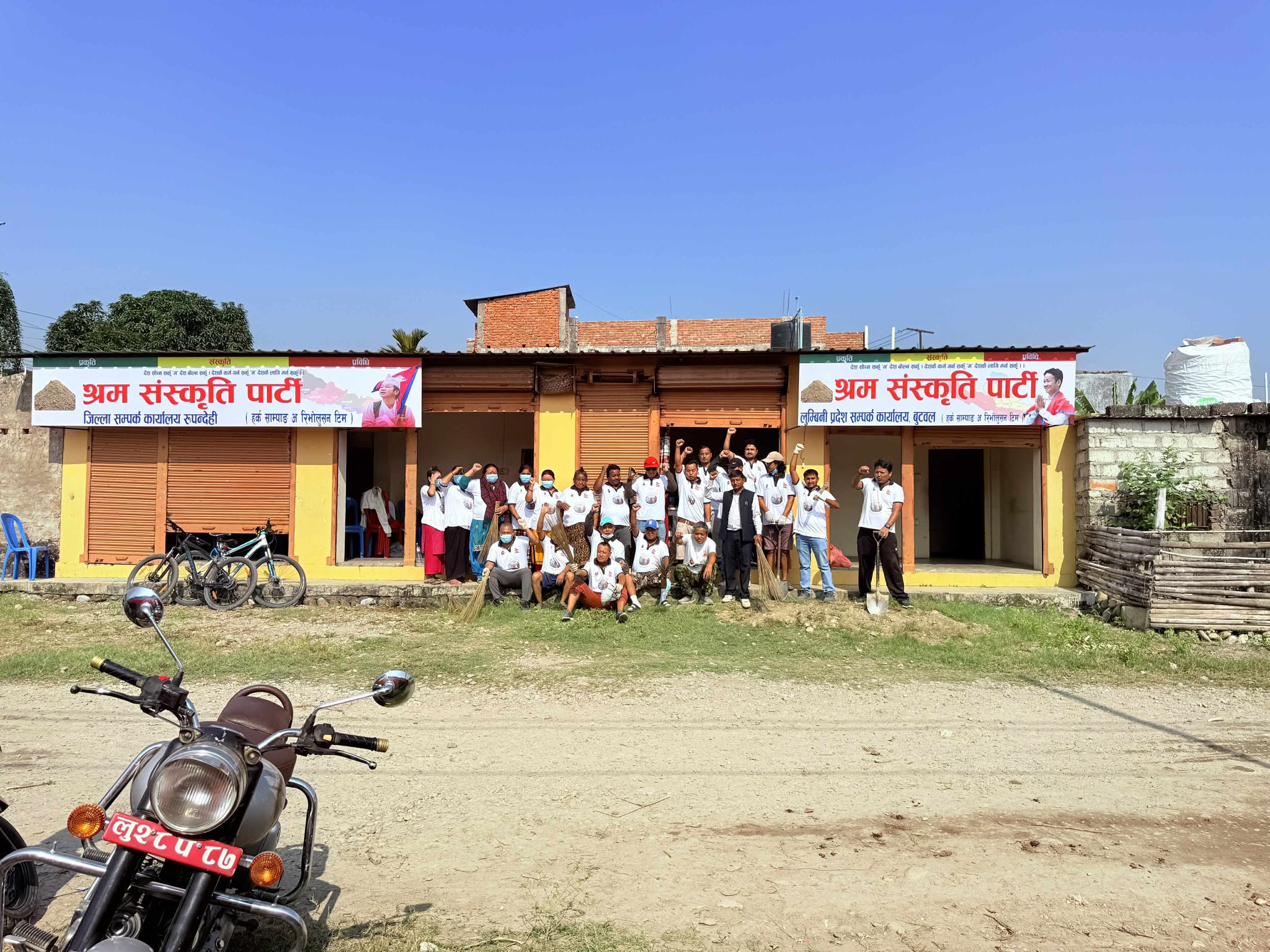 बुटवल । धरान उपमहानगरपालिकाका मेयर हर्क साम्पाङ नेतृत्वको श्रम संस्कृति पार्टीले बुटवलमा जिल्ला र प्रदेश कार्यालय स्थापना गरेको छ । आइतबार देवीनगर क्षेत्रमा सरसफाई गरी पार्टी कार्यालय स्थापना गरेको हो । पार्टीका प्रदेश संयोजक तुलबहादुर दर्लामी मगरले संगठनलाई बिस्तार गर्दै अघि बढने बताए । श्रम गर्दै अघि बढने पार्टीको अवधारणा अनुसार आफूहरु अघि बढने उनको भनाइ छ । पार्टीका केन्द्रीय सदस्य भीम गौतमले जिल्ला र प्रदेशका संगठनलाई पूर्णता दिने गरी लागेको बताए ।
