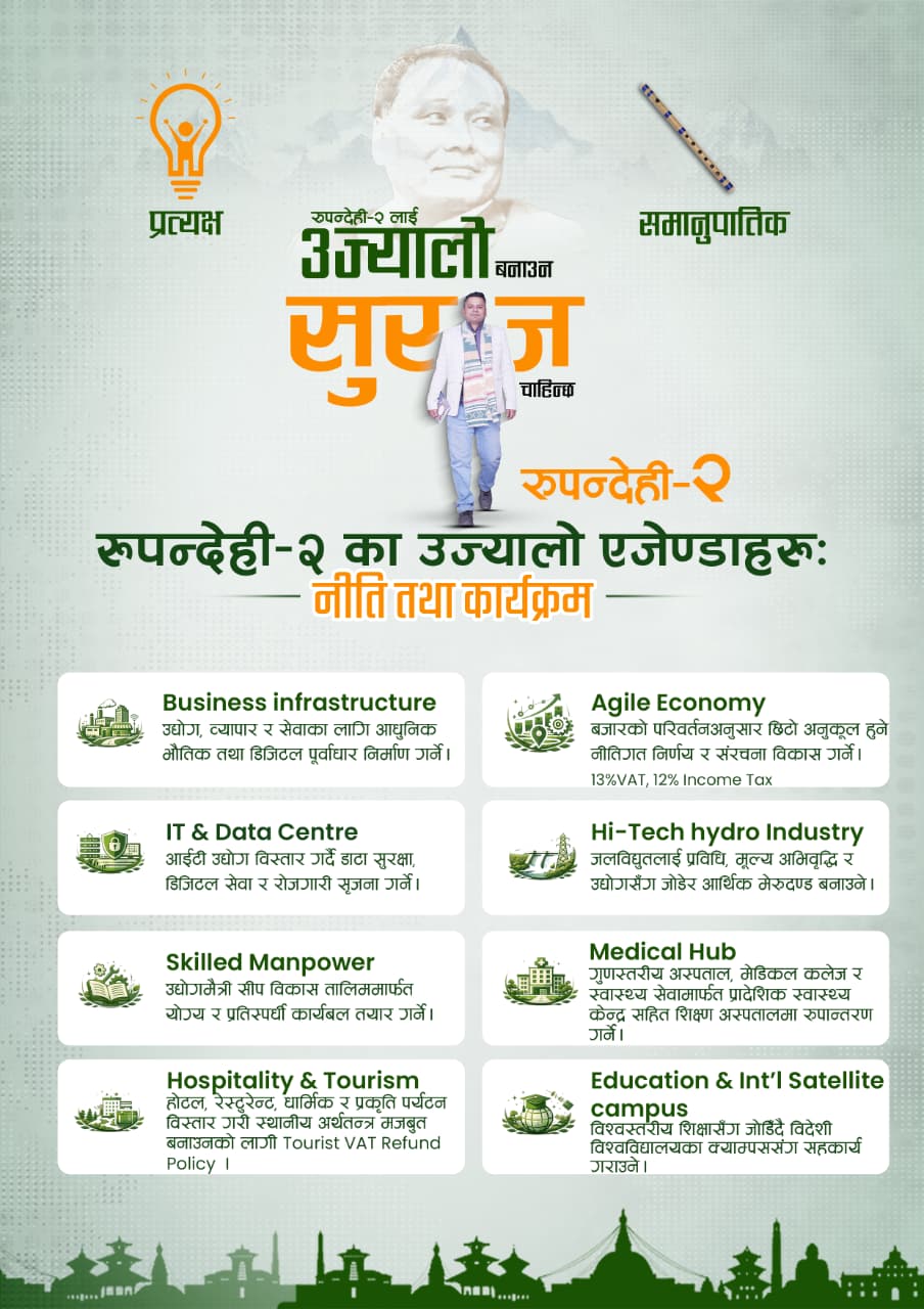 पूर्वाधार, ऊर्जा, सीप, डिजिटल रूपान्तरण, स्वास्थ्य, पर्यटन र शिक्षामार्फत समृद्ध रुपन्देही निर्माणको स्पष्ट दृष्टिकोणसहित उज्यालो नेपाल पार्टीबाट रुपन्देही–२ मा आफु उम्मेदवार बनेबो उनले बताए ।