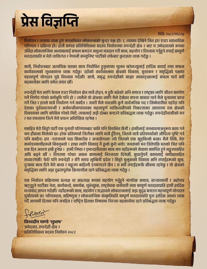 प्रेस विज्ञप्तिमा उनले निर्वाचन प्रक्रियामा प्रत्यक्ष तथा अप्रत्यक्ष रूपमा सहयोग गर्ने नागरिक समाज, सञ्चारकर्मी, विभिन्न दलका नेता–कार्यकर्ता, समर्थक तथा मतदाताप्रति धन्यवाद ज्ञापन गरेका छन्। लोकतान्त्रिक संस्कृतिलाई सुदृढ बनाउन सबैको भूमिका महत्त्वपूर्ण रहेको उनको भनाइ छ।