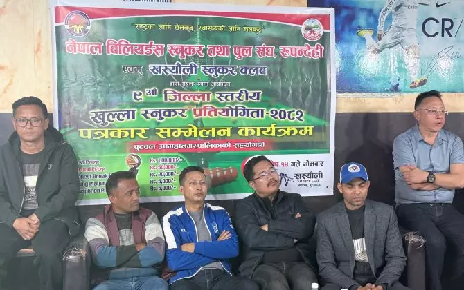 पुरा पढ्नुहोसबुटवल । नेपाल बिलियड्र्स पुल तथा स्नूकर संघ रुपन्देहीको आयोजनामा पुस दोस्रो सातादेखि बुटवलमा नवौं जिल्लास्तरीय खुल्ला स्नूकर प्रतियोगिता हुने भएको छ । बुटवलस्थित खस्यौली स्नूकर क्लबमा पुस १४ गते देखि एक हप्तासम्म प्रतियोगिता सञ्चालन...