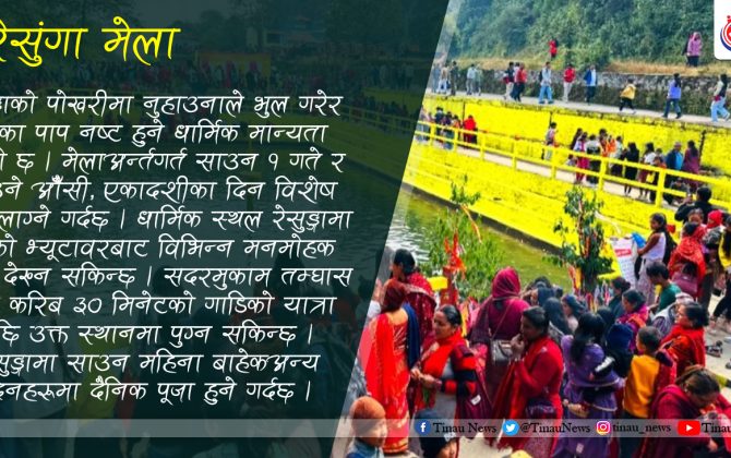 पुरा पढ्नुहोसगुल्मी । गुल्मी जिल्लाको धार्मिक तथा ऐतिहासिक पर्यटकिय क्षेत्र रेसुङ्गामा एक महिने साउने मेला सुुरु भएको छ । गुल्मीको सदरमुकाम तम्घास अग्लो शिरमा पर्ने रेसुङ्गामा विगतका वर्षहरुमा जस्तै यस वर्ष पनि मन्दिर व्यवस्थापन समितिले साउनभर...