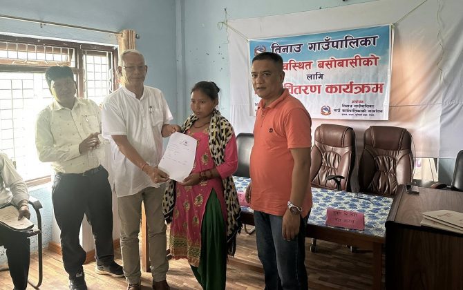 पुरा पढ्नुहोसबुटवल । पाल्पाको तिनाउ गाउँपालिकाले भूमिहिन दलीत, सुकुम्बासी तथा अव्यवस्थित घर–परिवारलाई जग्गाधनी पूर्जा वितरणको प्रक्रियालाई तिब्रता दिएको छ । यसैबीच गाउँपालिकाले वडा नम्बर १ देखि अव्यवस्थित बसोबासीलाई निस्सा वितरण सुरु गरेको छ । लामो समयदेखि...