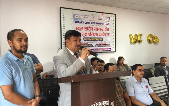 पुरा पढ्नुहोसबुटवल । रोटरी क्लब अफ लुम्बिनी स्टार्सले स्कूल स्तरिय स्वाश्थ्य, दाँत तथा मुख परिक्षण कार्यक्रम अन्तरगत १ लाख विद्यार्थीको दाँत परिक्षण महाअभियान सुरुवात गरेको छ । महाअभियान अन्तरगत विद्यार्थीहरुको मुख स्वाश्थ्यलाई ध्यानमा राखेर लुम्बिनी प्रदेशका...