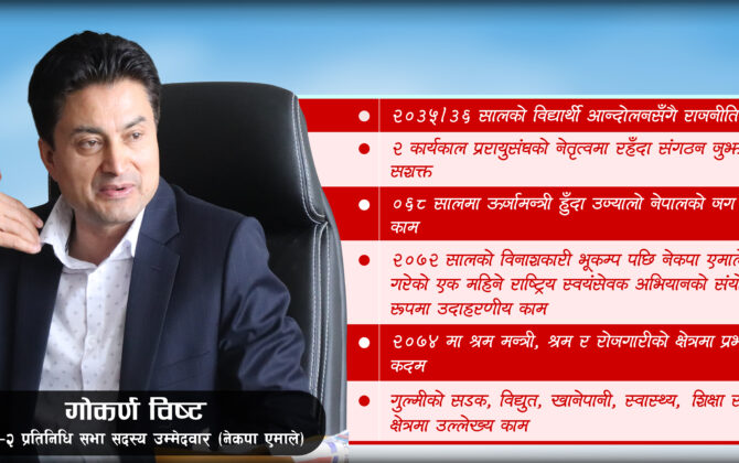 पुरा पढ्नुहोसगोकर्ण विष्ट नेकपा एमालेका केन्द्रिय सचिव हुन् । उनी इस्मा गाउँपालिका ४ दोहली बाँझमा २०२२ साल असार १७ गते जन्मिएका हुन् । उनले व्यवस्थापनमा स्नातकोत्तर र कानूनमा स्नातक गरेका छन् । बिष्टले ०३५÷०३६ सालको...