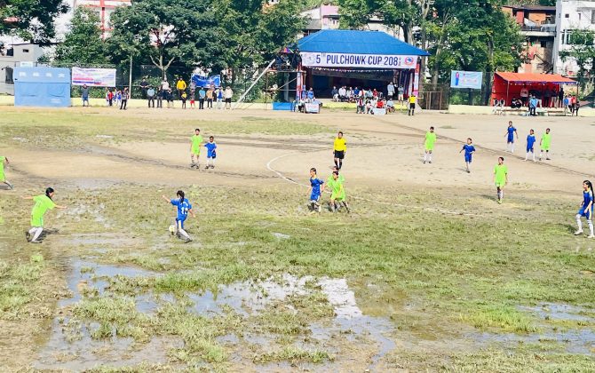 गुल्मीको सदरमुकाम तम्घासस्थित चिदीचौरको हिलो मैदानमा पुल्चोक स्पोर्टस क्लवको आयोजनामा फुटबल खेलमा प्रतिस्पर्धा गर्दै अर्जुन बोर्डिङ स्कुल र आदर्श बोर्डिङ स्कुलका छात्राहरू। उक्त प्रतियोगितामा  जिल्लाका १४ विद्यालयका छात्रा टोलीको सहभागिता रहेको छ । तस्बिर :...