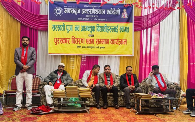 पुरा पढ्नुहोसप्राविधिक शिक्षा प्रदान गर्दै आएको बुटवलको अक्सवृज ईन्टरनेश्वल एकेडेमीमा सरस्वती पुजा तथा नवआगन्तुक विद्यार्थीहरुलाई स्वागत कार्यक्रम गरिएको छ । कार्यक्रमको तिलोत्तमा नगरपालिकाका नगरप्रमुख रामकृष्ण खाडले उद्घाटन गर्दै शिक्षा र संस्कार दुबै एउटै सिक्काका दुई...