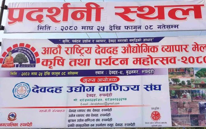 रुपन्देहीको देवदहमा संचालन हुन लागेको आठौं राष्ट्रिय देवदह औद्योगिक व्यापार मेला, कृषि तथा पर्यटन महोत्सवको तयारी अन्तिम चरणमा पुगेको छ । देवदह उद्योग बाणिज्य संघ रुपन्देहीको आयोजनामा माघको २५ गतेदेखि फागुन ८ गतेसम्म संचालन हुन...