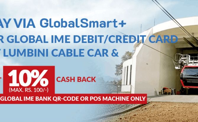 ग्लोबल आइएमई बैंकका ग्राहकहरुलाई बुटवलको लुम्बिनी केबलकार चढ्दा टिकटमा १० प्रतिशत क्यासब्याक (छुट) पाउने भएका छन् । बैंकले लुम्बिनी केबल कारको टिकट खरिदमा क्यासब्याक उपलब्ध हुने योजना सार्वजनिक गरेको हो । यो योजनाअन्तर्गत ग्लोबल आइएमई...
