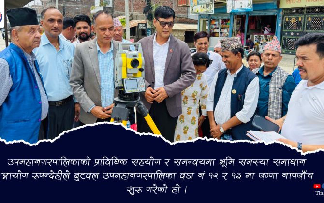 बुटवल । बुटवल उपमहानगरपालिकामा लालपूर्जाविहीन क्षेत्रको जग्गा नापजाँचको काम शुरु भएको छ । बुटवल उपमहानगरपालिकाको प्राविधिक सहयोग र समन्वयमा भूमि समस्या समाधान आयोग रुपन्देहीले बुटवल उपमहानगरपालिका वडा नं १२ र १३ मा जग्गा नापजाँच शुरु...