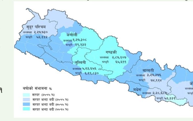 काठमाडौं । सरकारले यस वर्षको मनसुन अवधिमा देशभर ४ लाख ५७ हजार १४५ घरधुरीका १९ लाख ९७ हजार ७३१ जनसंख्या प्रभावित हुने आँकलन गरेको छ । सबैभन्दा धेरै जनसंख्या लुम्बिनी प्रदेशमा र सबैभन्दा कम...