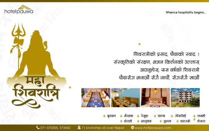 पुरा पढ्नुहोसबुटवल । होटल पौवाले शिवरात्रीको अवसरमा होटलमा आउने ग्राहकहरुलाई भजनकिर्तनमा नचाउने भएको छ । शिवरात्रीका दिन पौवाका सबै शाखाहरुमा विशेष पुजाअर्चना गर्दै साझ ५ बजेपछि भजनकिर्तनमा ग्राहकलाई नचाउने कार्यक्रम राखिएको होटल पौवाले जनाएको छ...